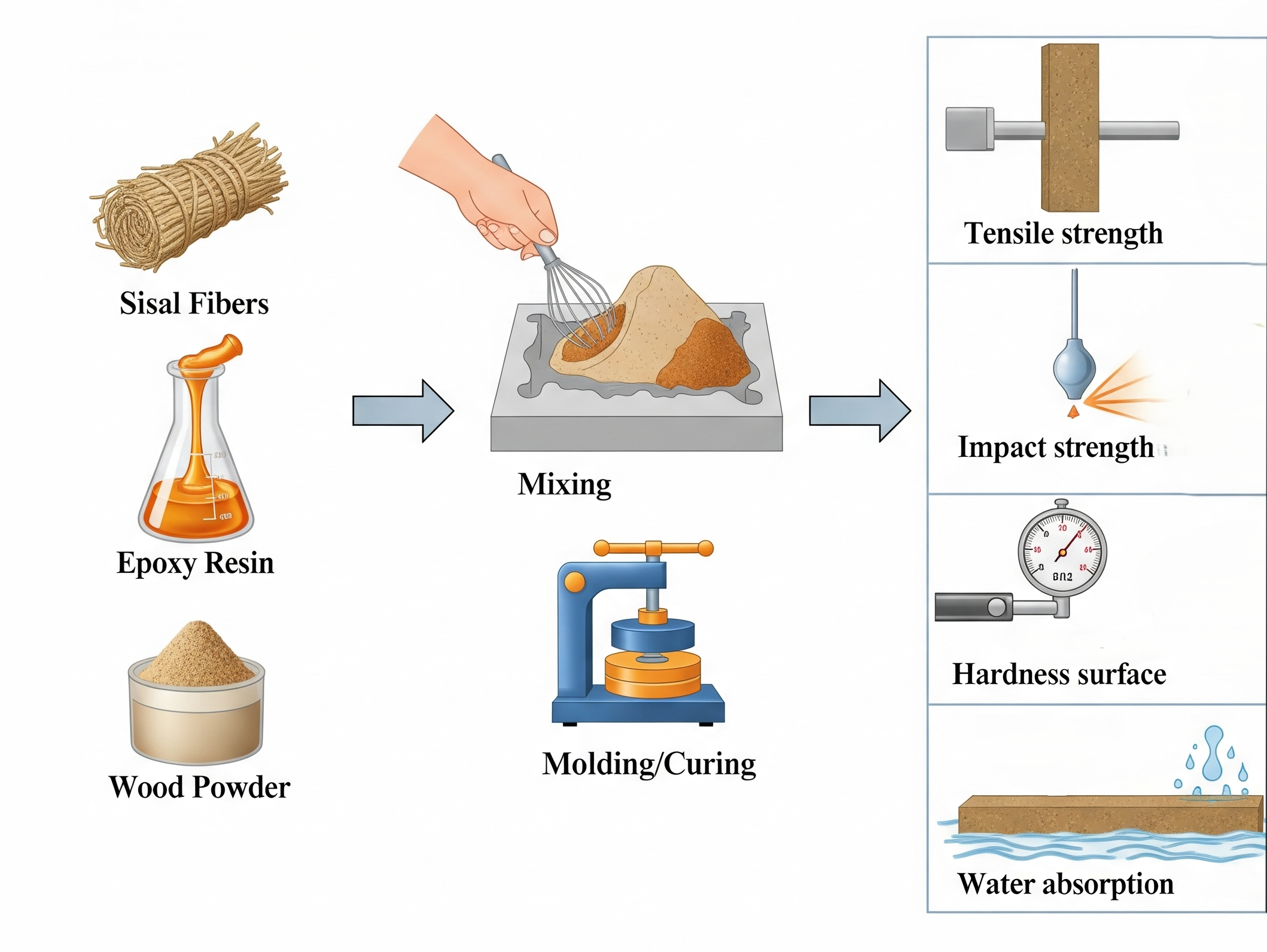 This study aims to de- velop hybrid composites reinforced with sisal fibers and wood powder fillers, focusing on minimizing void formation that weakens the com- posite. By exploring microstructural bonding mechanisms, it seeks to optimize fiber-matrix adhesion for improved composite efficiency. In addition, this study will evaluate various properties of the developed hybrid composites, such as tensile strength, water absorption, and im- pact resistance, to assess their suitability for real-world applications.