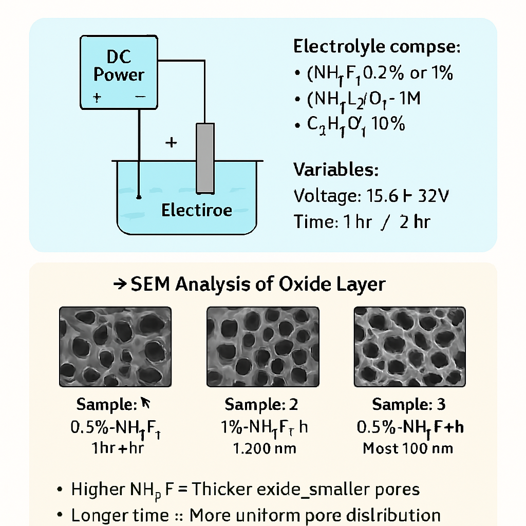 The objective of aluminum anodization is to investigate how NH₄F concentrations affect the morphology and properties of anodized aluminum, including the structure and composition of the oxide layer. This study also aims to assess the interactions of ethylene glycol, ammonium fluoride, and ammonium sulfate during the anodization process and determine the optimal ammonium fluoride concentrations for desired anodization rates. The goal is to create a durable, corrosion-resistant aluminum oxide coating by passing an electric current through an electrolyte, with parameters like voltage, current density, and electrolyte composition influencing the thickness, hardness, color, and texture.