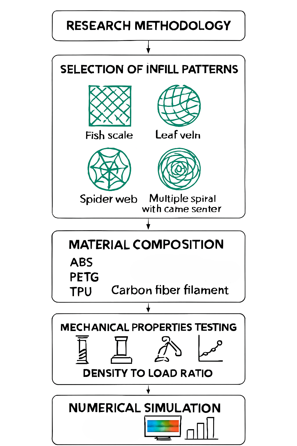 This research is expected to demonstrate that bio-inspired infill structures such as fish scale, leaf vein, spider web,and multi sprial provide distinct advantages over conventional patterns in terms of strength-to-weight efficiency and energy absorption. The outcomes will likely show that each infill exhibits unique mechanical benefits depending on the applied loading mode and material—for instance, TPU structures may excel in impact resistance and flexibility, while carbon-fiber composites achieve superior stiffness and strength. By correlating relative density with tensile, flexural, compression, and impact properties, specific performance metrics such as strength-to-weight index and specific modulus will be established. Finite element simulations are anticipated to validate experimental results within acceptable error margins, also highlighting critical stress concentration zones and failure modes consistent with fracture surface analysis. Overall, the study will deliver practical guidelines on selecting bio-inspired architectures for targeted industrial applications, while contributing novel insights into the structure property relationships of 3D-printed polymers and composites.